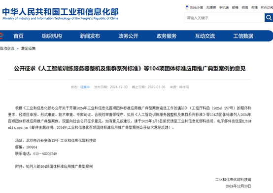 工信部1230日發布消息,根據《工業和信息化部辦公廳關于開展2024年工業和信息化百項團體標準應用推廣典型案例遴選工作的通知》(工信廳科函〔2024257號)的程序和要求,經項目申報、形式審查、技術審查、專家論證、合規性審查等程序,擬將《人工智能訓練服務器整機及集群系列標準》等104項團體標準列入2024年百項團體標準應用推廣典型案例,現面向社會公開征求意見。