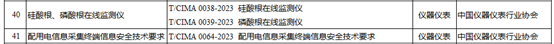 由中國儀器儀表行業協會發布的3項團體標準T/CIMA 0038-2023《硅酸根在線監測儀》、T/CIMA 0039-2023《磷酸根在線監測儀》和T/CIMA 0064-2023《配用電信息采集終端信息安全技術要求》被納入公示名單。