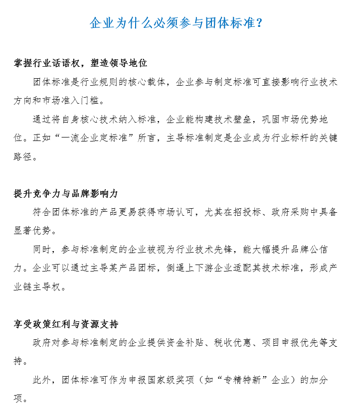 2022年,國家17部門聯(lián)合發(fā)布《關(guān)于促進(jìn)團(tuán)體標(biāo)準(zhǔn)規(guī)范優(yōu)質(zhì)發(fā)展的意見》,鼓勵(lì)團(tuán)體標(biāo)準(zhǔn)在招投標(biāo)中的實(shí)施應(yīng)用。