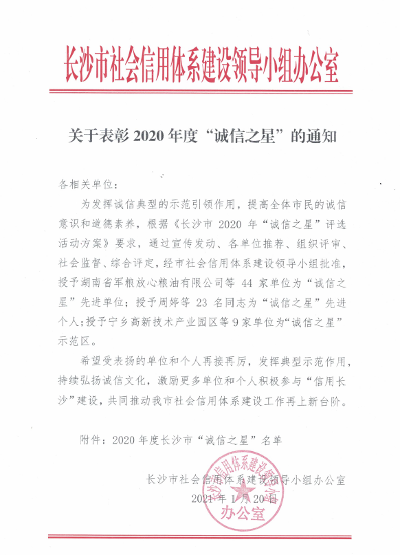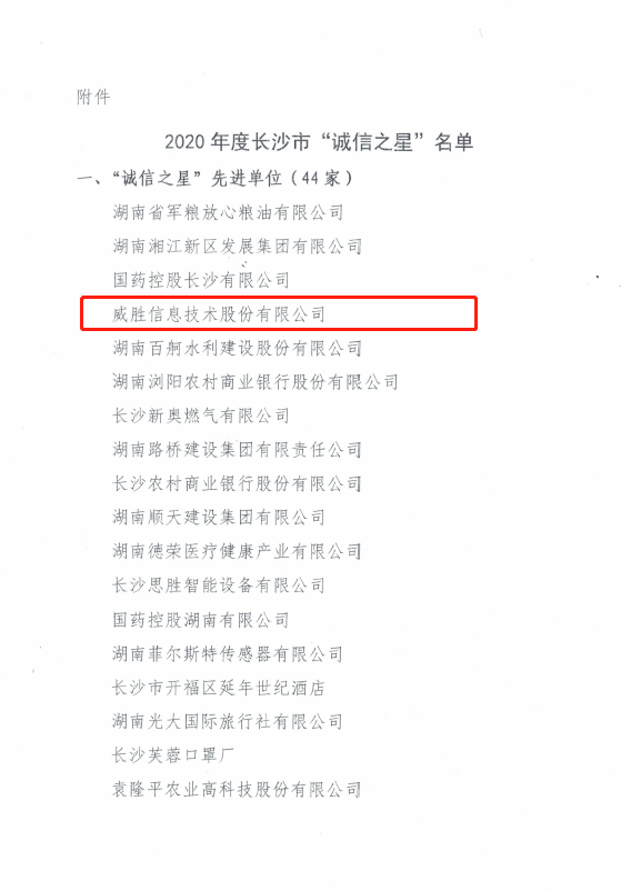 為推進(jìn)長(zhǎng)沙市社會(huì)信用體系建設(shè),提高全社會(huì)信用水平,樹立“信用長(zhǎng)沙”品牌,營(yíng)造優(yōu)良營(yíng)商環(huán)境,根據(jù)《長(zhǎng)沙市2020年“誠(chéng)信之星”評(píng)選活動(dòng)方案》要求,經(jīng)過(guò)層層推薦、審核、評(píng)審,威勝信息技術(shù)股份有限公司榮獲長(zhǎng)沙市社會(huì)信用體系建設(shè)領(lǐng)導(dǎo)小組辦公室頒發(fā)的“誠(chéng)信之星”榮譽(yù)稱號(hào)。
