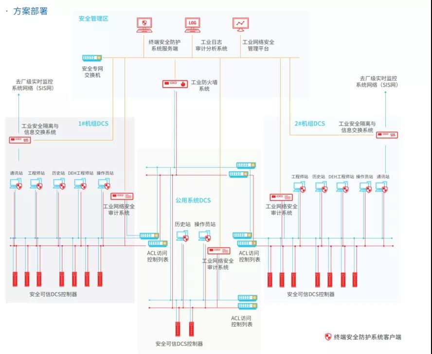 和利時(shí)典型火電控制系統(tǒng)網(wǎng)絡(luò)安全解決方案,遵照等保2.0與能源局36號(hào)文等政策法規(guī)要求,遵循“安全分區(qū)、網(wǎng)絡(luò)專用、橫向隔離、縱向保證”防御體系,針對(duì)火電廠監(jiān)控系統(tǒng)進(jìn)行安全防護(hù)設(shè)計(jì)。對(duì)火電廠監(jiān)控系統(tǒng)進(jìn)行合理的區(qū)域劃分,通過(guò)防護(hù)方案使火電廠生產(chǎn)監(jiān)控系統(tǒng)具有抵御黑客、病毒、惡意代碼等網(wǎng)絡(luò)與應(yīng)用系統(tǒng)的破壞和攻擊,阻止內(nèi)部人員的非法訪問(wèn),抵御外部攻擊,在遭受攻擊和破壞后能及時(shí)恢復(fù)系統(tǒng)的能力,確保關(guān)鍵業(yè)務(wù)數(shù)據(jù)的可用性、機(jī)密性、完整性。