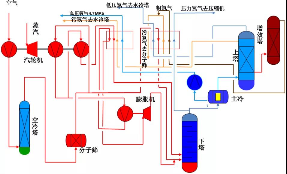 多次的重復(fù)上述過(guò)程,氣相的氮濃度就不斷增加,液相的氧濃度也能不斷的增加。這樣經(jīng)過(guò)多次的蒸發(fā)與冷凝就能完成整個(gè)精餾過(guò)程,從而將空氣中的氧和氮分離開(kāi)來(lái)。空氣在下塔被初步精餾為氣氮、污液氮和富氧液空,以節(jié)流閥減壓降溫后送至上塔作為上塔的回流液,進(jìn)一步實(shí)現(xiàn)精餾,最終在上塔頂部得到純氮?dú)猓虏康玫胶细竦囊貉醍a(chǎn)品。
