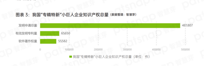 在這些“專精特新”小巨人企業(yè)中,專利申請(qǐng)總量48.18萬件,平均單企業(yè)專利申請(qǐng)98件;有效發(fā)明專利量6.57萬件,平均每家企業(yè)有效發(fā)明專利量約13件;軟件著作權(quán)共5.56萬件,平均每家企業(yè)擁有軟件著作權(quán)約11件。