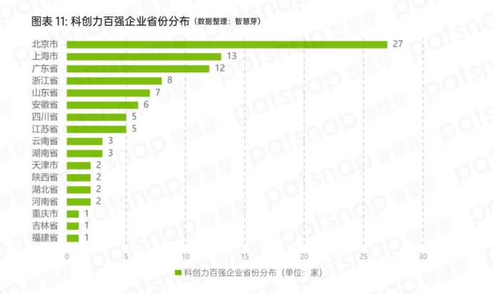 《報(bào)告》顯示,科創(chuàng)力排名前100企業(yè)的省份分布中,排名前三的省份分別為北京市、上海市和廣東省,分別有27家、13家和12家企業(yè)上榜。而浙江省、山東省、安徽省和江蘇省分別有 8、7、6、5 家企業(yè)上榜。