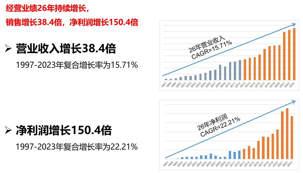 成立26年來,公司銷售增長38.4倍,凈利潤增長150.4倍,凈利潤年復合增長達22.21%。