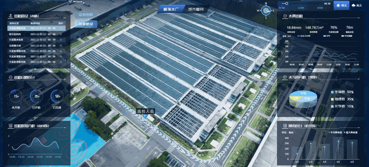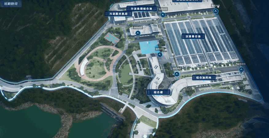 該項目位于位于福建省,設計規模10萬m³/d,項目旨在通過打造該水廠數字孿生可視化管理平臺,提高水廠智能化管理水平。基于BIM數據或CAD圖紙,項目對廠區進行三維建模,還原廠區建筑物、構筑物、工藝區間、設備等三維全貌,實時監控廠區各項參數,提供數據展示,設備信息查看等功能,為運營管理提供場景式的決策支持;采用3D渲染技術及VR虛擬現實技術,打造沉浸式、智慧化的運營管理模式。正泰中自的水務數字孿生技術可以幫助智慧水廠更好地集成和理解生產信息、提升管理效能。