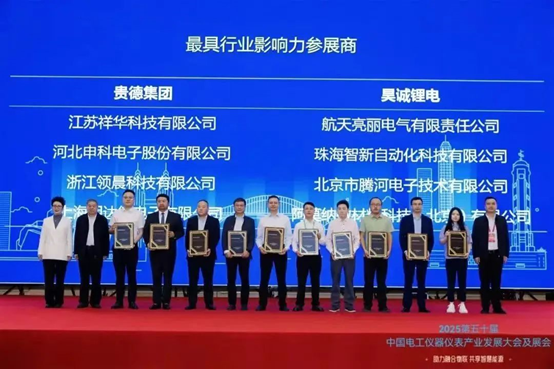 展會規模空前,參會人數400余人,近200家參展企業展示了傳感器、電容器、開關與繼電器等產品。采用 “以會帶展、以展促會” 模式,打通電工儀器儀表行業全產業鏈條,推動各環節緊密銜接與協同發展。今年恰逢第50屆行業大會,為彰顯會議的特殊意義和重要貢獻,特別舉辦了“最具行業影響力展商”評選活動,評選出貴德集團等十家行業內最具代表性的品牌企業。工業和信息化部裝備工業一司原一級巡視員、中國儀器儀表行業協會九屆理事會副理事長候選人(駐會)苗長興,中國儀器儀表行業協會副秘書長程紅,以及哈爾濱電工儀表研究所有限公司黨委書記、董事長趙斌為這10家最具影響力的參展商隆重授牌。