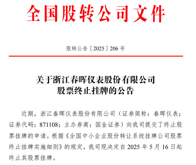 2025 年 5 月 13 日,全國中小企業股份轉讓系統有限責任公司發布股轉公告〔2025〕206 號,宣布浙江春暉儀表股份有限公司(證券簡稱:春暉儀表)向其提交了終止股票掛牌的申請。依據《全國中小企業股份轉讓系統掛牌公司股票終止掛牌實施細則》規定,全國股轉公司決定自 2025 年 5 月 16 日起終止春暉儀表股票掛牌。