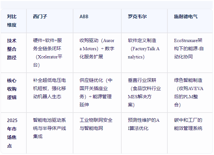 以ABB為例,其2024年收購Sensorfact BV的能源管理SaaS平臺,與西門子Safe Velocity安全解決方案形成直接競爭。而羅克韋爾通過收購MES廠商Plex Systems,構建了覆蓋生產執行到質量管理的閉環系統,與西門子Teamcenter PLM形成差異化。