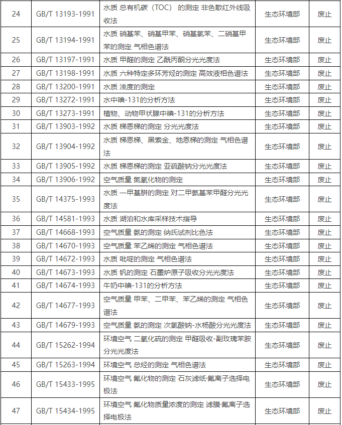 此次擬廢止的標準主要集中于環境監測領域,涵蓋土壤、水質、空氣、生物樣品等多種介質中污染物的檢測方法,涉及放射性核素(如钚、鈾、銫-137、鍶-90、碘-131)、常規污染物(如化學需氧量、氨氮、總氮、溶解氧、揮發酚、氟化物、氰化物)、有毒有害有機物(如苯系物、多環芳烴、揮發性鹵代烴、硝基苯類、農藥類、石油類)以及重金屬(如鉻、銅、鋅、釩、銀、鋇、汞)等關鍵指標的測定技術。