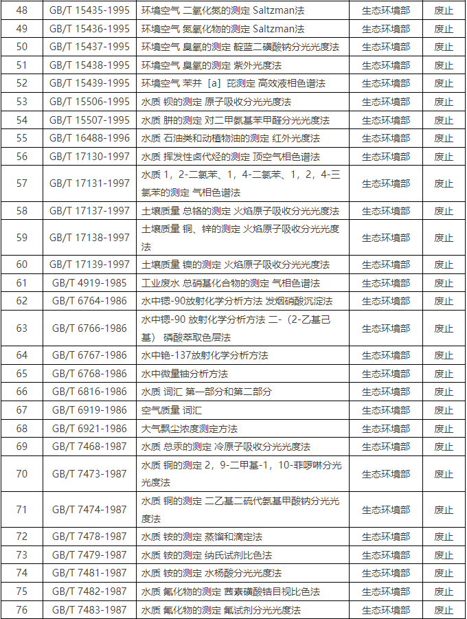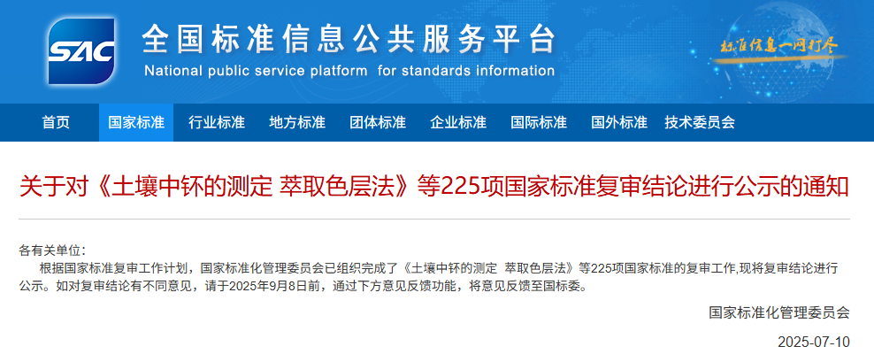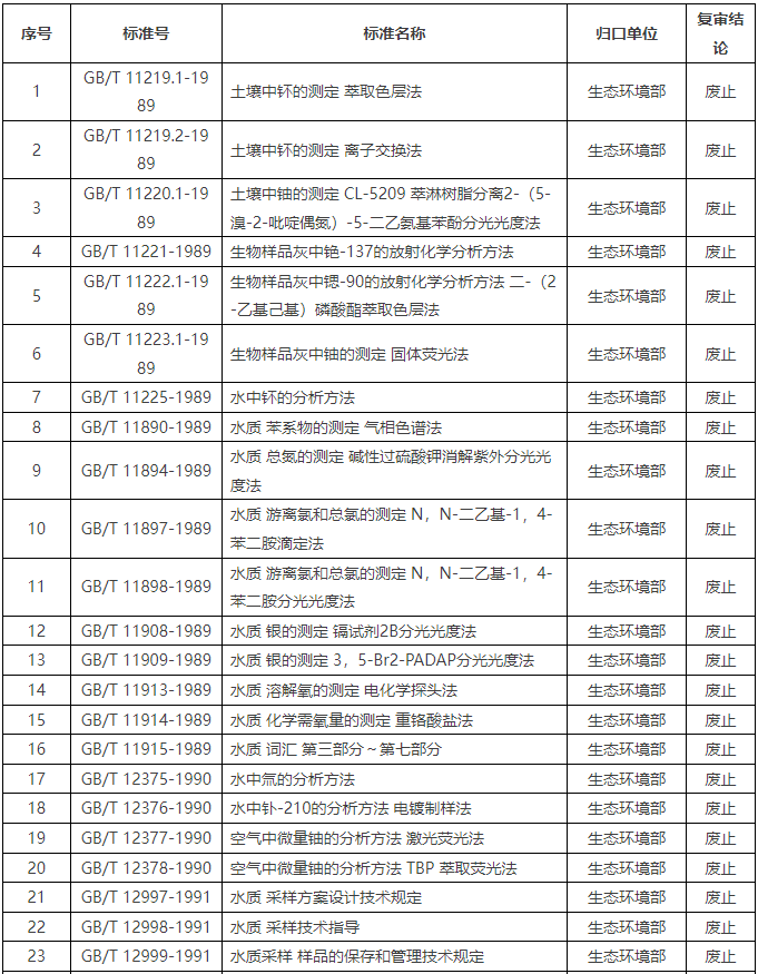 國家標準化管理委員會近日發布通知,對《土壤中钚的測定 萃取色層法》等225項國家標準的復審結論進行公示。根據公示內容,其中由生態環境部歸口管理的84項國家標準被建議廢止,且廢止過渡期為“公告即廢止”。