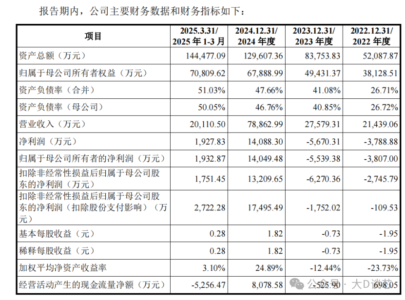 2022年至2025年3月,公司營業收入分別為2.144億元、2.758億元、7.886億元和2.011億元,歸屬于母公司股東的凈利潤分別為-3807.00萬元、-5539.38萬元、14,049.48萬元和1,932.87萬元。綜合毛利率分別為43.61%、60.50%、63.63%和65.33%。