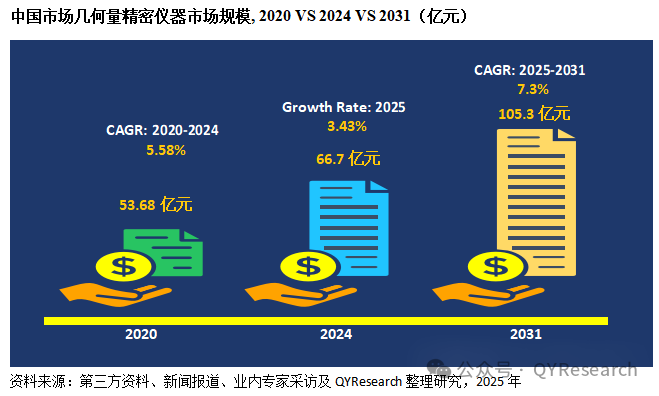幾何量精密儀器是指用于測量物體長度、角度、形狀、位置、輪廓、形位誤差等幾何參數(shù)的高精度測量設(shè)備,是計(jì)量測試領(lǐng)域的基礎(chǔ)儀器之一,在工業(yè)生產(chǎn)、國家計(jì)量等領(lǐng)域具有重要作用。根據(jù)研究團(tuán)隊(duì)調(diào)研統(tǒng)計(jì),中國市場在過去幾年變化較快,2024年中國幾何量精密儀器市場銷售額達(dá)到了66.7億元,預(yù)計(jì)2031年將達(dá)到105.3億元,年復(fù)合增長率(CAGR)為7.3%(2025-2031)。