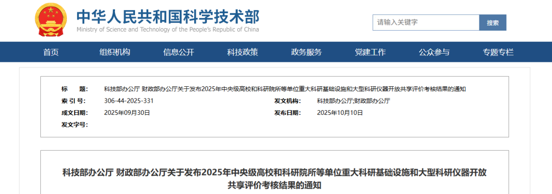 10月10日,科技部辦公廳、財政部辦公廳發(fā)布了《關于發(fā)布2025年中央級高校和科研院所等單位重大科研基礎設施和大型科研儀器開放共享評價考核結(jié)果的通知》。