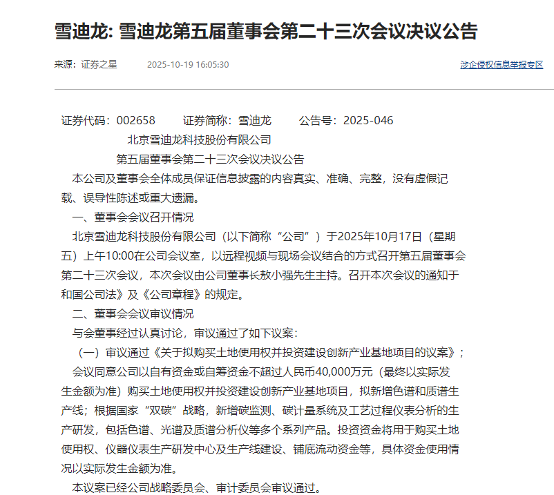 1019日晚間,北京雪迪龍科技股份有限公司(股票代碼:002658)發布一則重磅公告,擬投資不超過4億元,購買位于北京市昌平區的國有建設用地使用權并建設包括色譜和質譜生產線的創新產業基地項目。