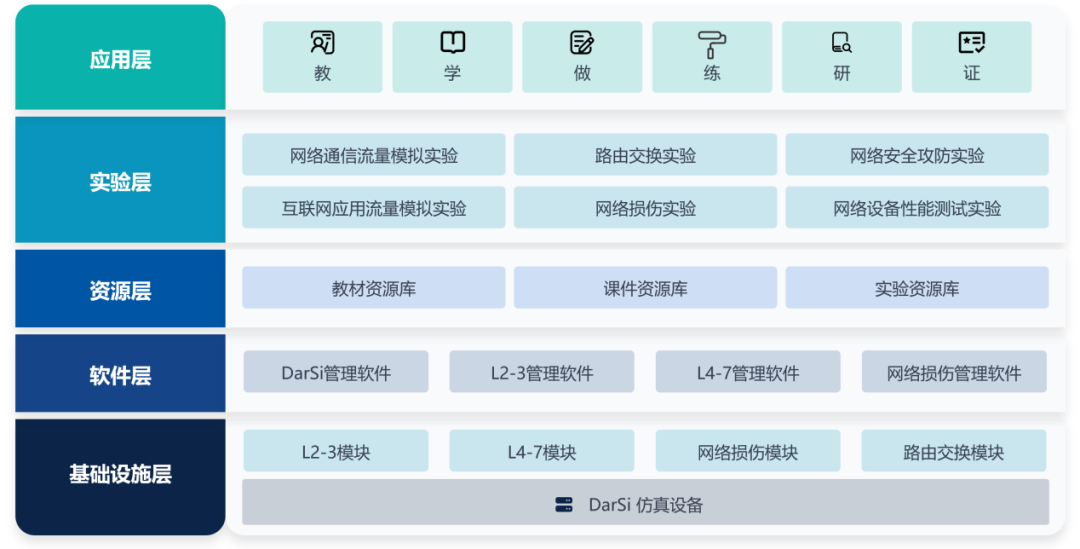 1. 應(yīng)用層 (Application Layer):面向最終用戶,構(gòu)建了“教、學(xué)、做、練、研、證”六位一體的教學(xué)與認(rèn)證閉環(huán)。它不僅是一個(gè)工具,更是一個(gè)完整的教學(xué)、實(shí)踐和能力評(píng)估生態(tài)系統(tǒng)。