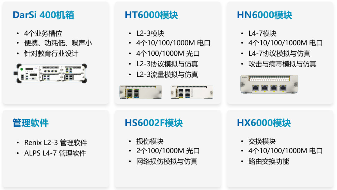 5. 基礎(chǔ)設(shè)施層 (Infrastructure Layer):以DarSi 設(shè)備為基礎(chǔ),集成了模塊化的硬件功能,包括 L2-3模塊、L4-7模塊、網(wǎng)絡(luò)損傷模塊和路由交換模塊。這為模擬真實(shí)網(wǎng)絡(luò)環(huán)境的“規(guī)?!焙汀皬?fù)雜度”提供了強(qiáng)大的硬件保障。