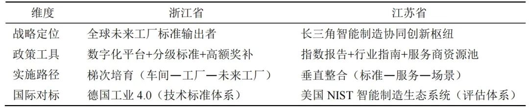 在國際對標維度:浙江省對標德國工業4.0技術標準體系,強化制造流程與技術規范;江蘇省借鑒美國NIST智能制造生態系統評估體系,完善智能制造生態系統建設。