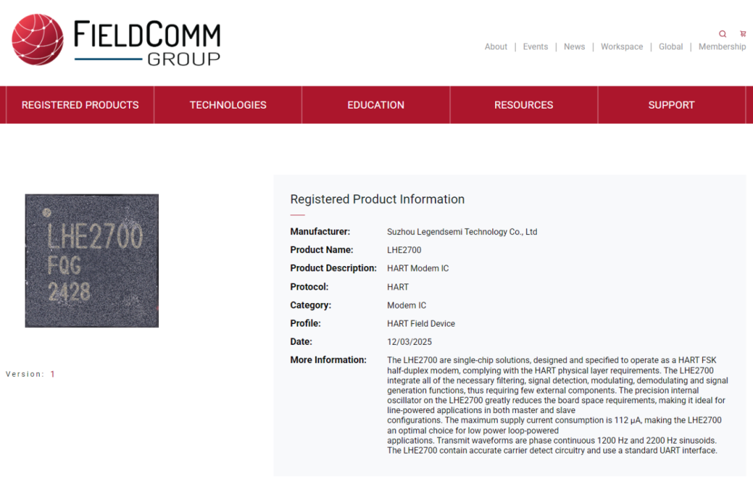 近日,領慧立芯旗下LHE2700 集成精密振蕩器的低功耗 HART 調制解調器,成功通過國際權威機構 FieldComm Group HART® 通信協議認證。這一里程碑式的突破,不僅標志著 LHE2700 在工業通信協議兼容性、技術可靠性上達到國際標準,更意味著國產工業級模擬芯片在關鍵領域實現了與國際先進水平的精準對標,為工業自動化設備的國產化升級注入強勁 “芯” 動力。