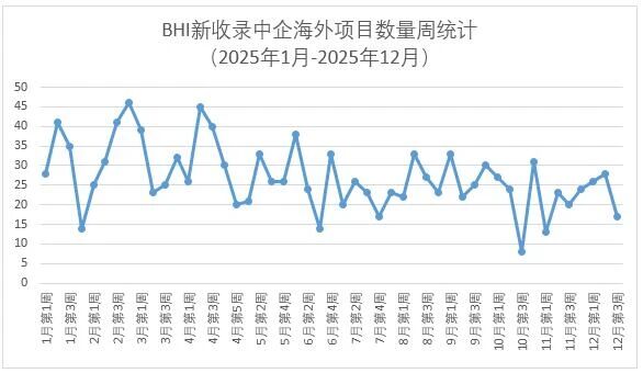 BHI中企海外項目數據庫監測,1215-19BHI新收錄中企新簽約/中標/公告海外項目17個,較此前有所回落。2025年新收錄項目超過1320個。近一年每周新收錄項目數量趨勢統計詳見下圖。