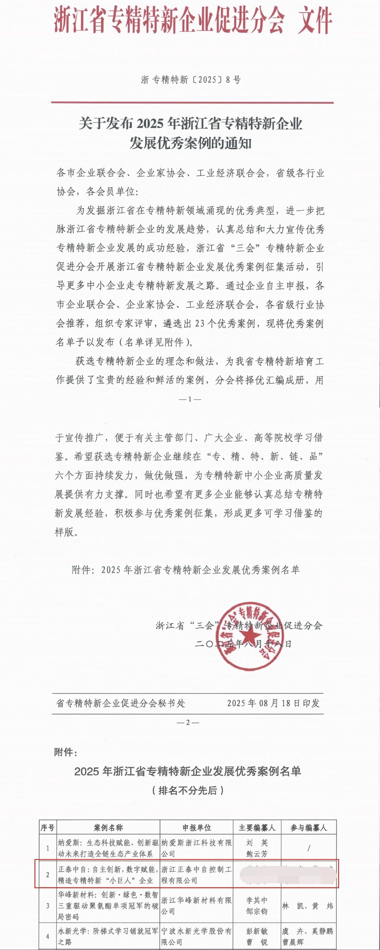 正泰中自入選2025年度浙江省專精特新發(fā)展優(yōu)秀案例