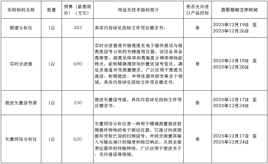 2025 年12月17日至12月19日,南開大學智能光子研究院在中國政府采購網連續發布四項招標公告,預算金額1945萬元,涉及四款最高端的電子測試儀器:預算620萬元矢量網絡分析儀1臺、預算250萬元微波矢量信號源1臺、預算385萬元頻譜分析儀1臺、預算690萬元實時示波器1臺。